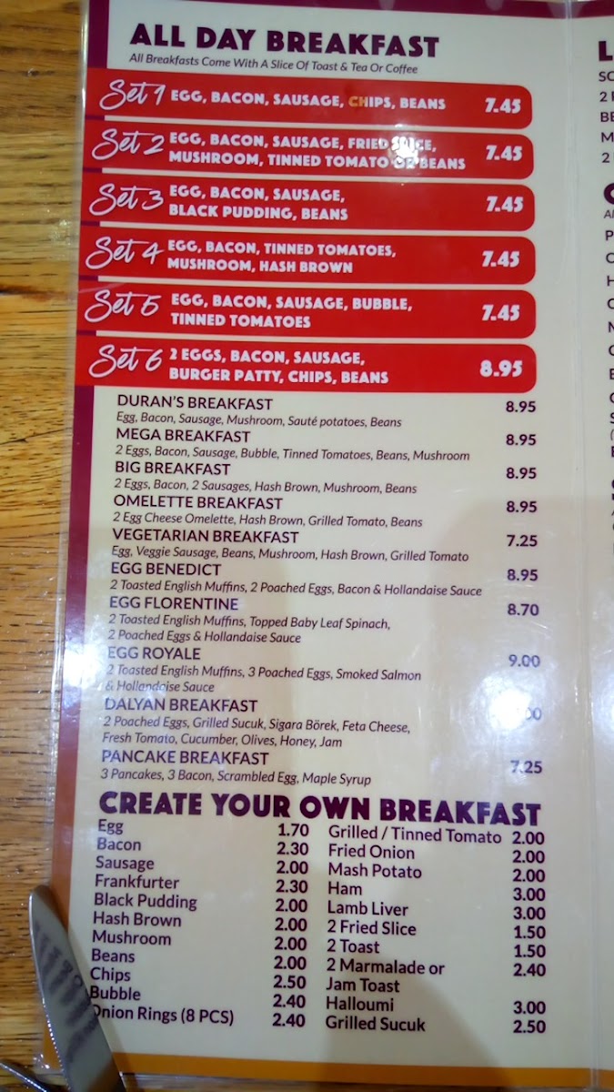 All Day Breakfast includes a variety of traditional breakfast items such as Duran's Breakfast, Mega Breakfast, Big Breakfast, Omelette Breakfast, and several egg-based dishes like Egg Benedict, Egg Florentine, and Egg Royale. Options also include vegetarian and specialized breakfasts like the Vegetarian Breakfast, Dalyan Breakfast, Pancake Breakfast, and Hans Breakfast.